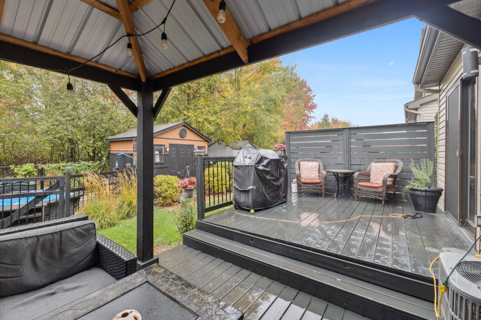 Inclus : réfrigérateur, poêle, lave-vaisselle, laveuse, sécheuse, échangeur d'air, a/c central, ouvre porte électrique garage, stores, 2 foyers électriques, tablettes au murs intérieurs, système alarme (non-relié).